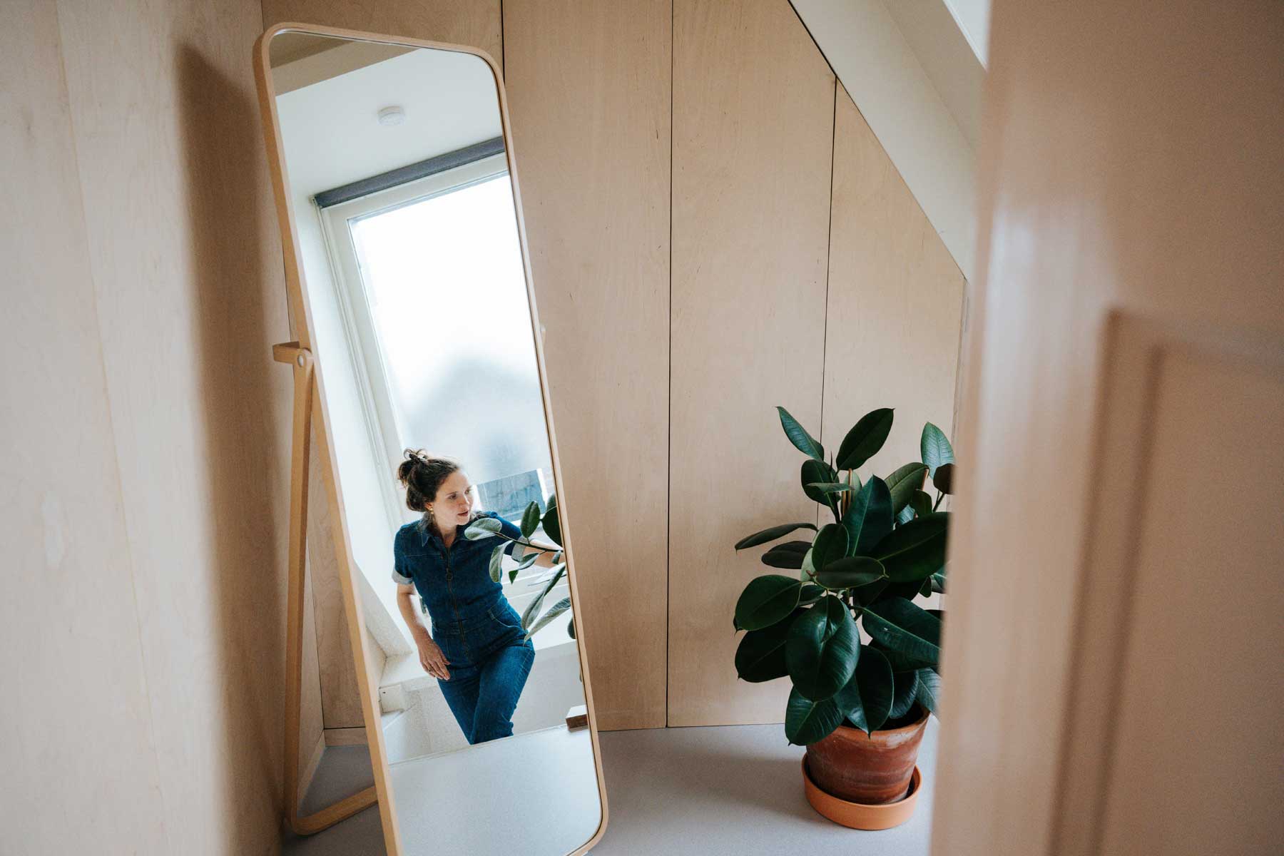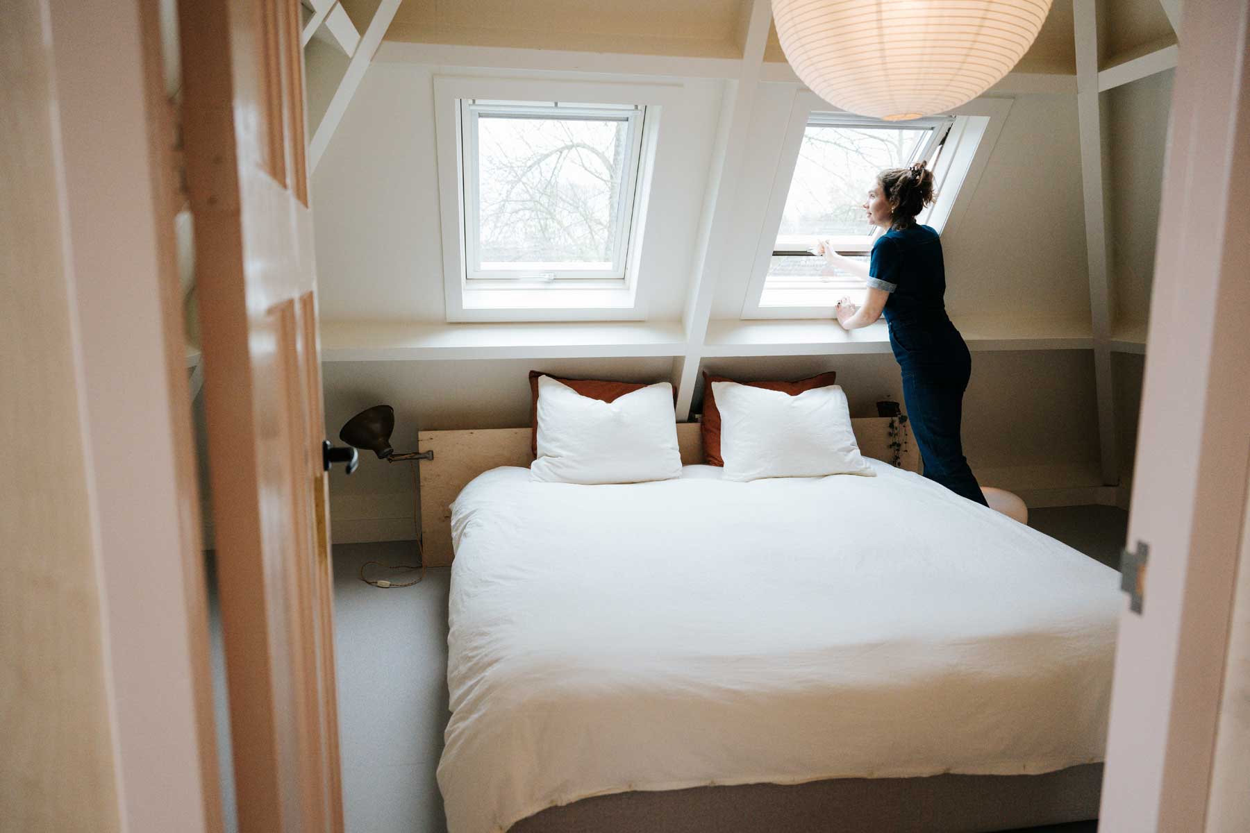 Aan deze slaapkamer grenst de badkamer van hierboven. Dit was best een donkere ruimte, door het open breken van de plafonds kreeg ik de mogelijkheid om kozijnen in plaats van wanden tussen de ruimtes te plaatsen. Dit zorgt voor veel meer lichtinval en een ononderbroken lijnenspel van de balken. Een tweedehands IKEA Pax kast werd op maat gemaakt en in de kleur van de wand geschilderd. De oude houten plankenvloer was erg beschadigd, maar kon nog prima een ronde mee door ‘m in de witte lak te zetten.