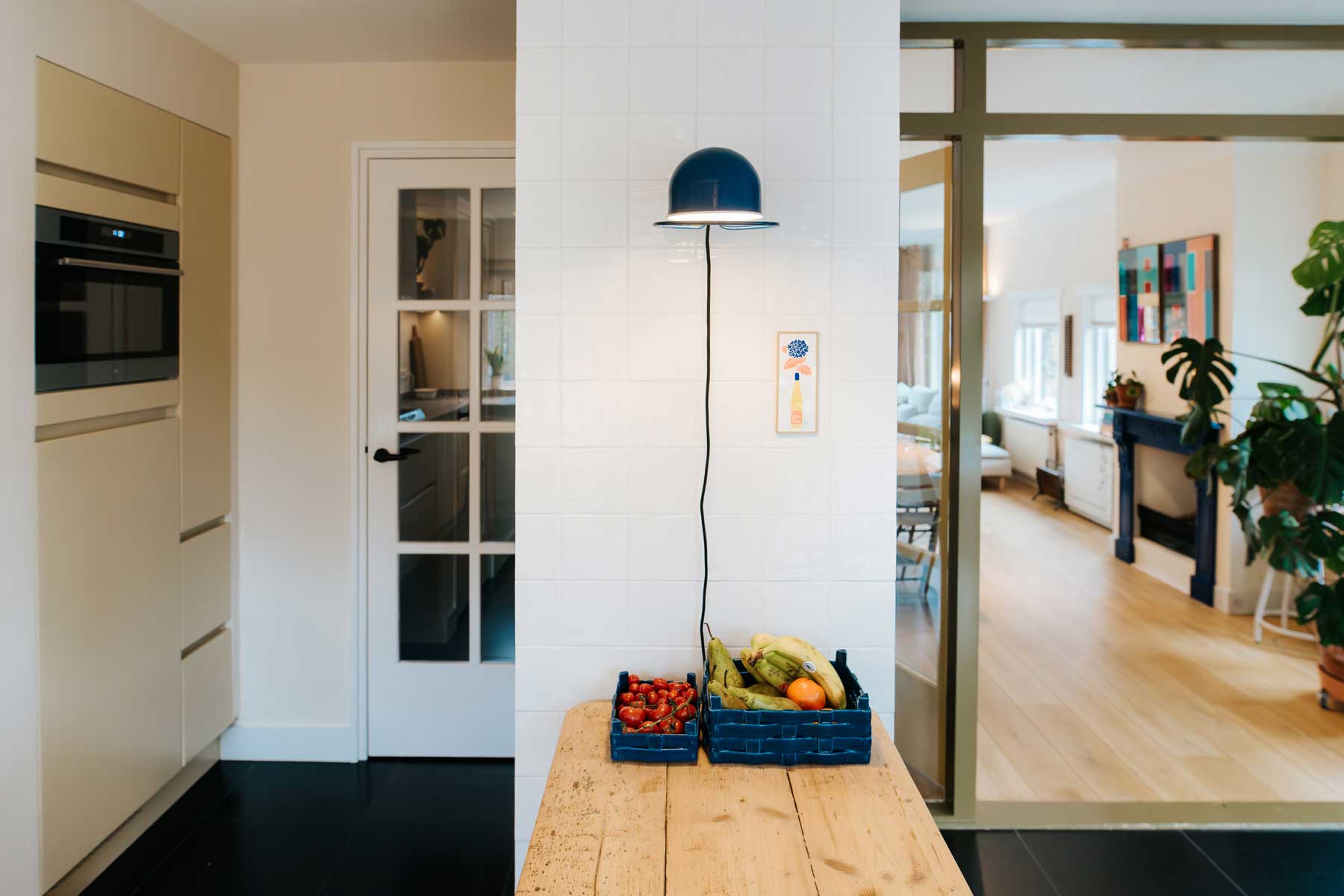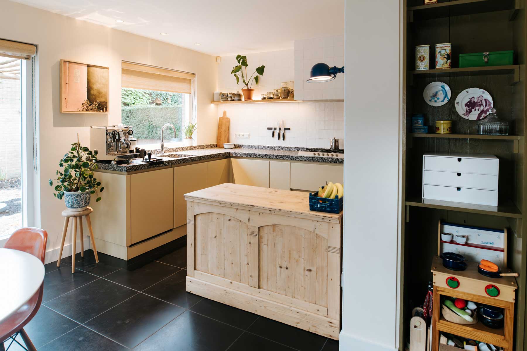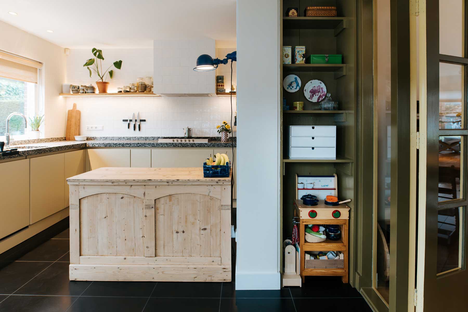 Deze keuken voldeed nog prima, maar kon wel wat kleur gebruiken. Het is gelukt om een wat kille witte keuken, ondanks de antracietkleurige tegelvloer, veel meer sfeer te geven. Een oude grenen toonbank zorgt voor extra warmte en extra werk- en opbergruimte. De keukendeurtjes liet ik van hoogglanswit naar een prachtige ‘niet groen en niet geel’ spuiten. Aansluitend op de donkergroen-bruine (LAB Paint Hunter) en-suite deuren en kast. De achterwand werd betegeld. Ook de verlichting werd aangepakt, de bestaande spots werden vervangen door verdiepte spots aan de raam-zijde. De spots aan de lange zijde maakten plaats voor een wandplank met zowel boven als onder ledverlichting.